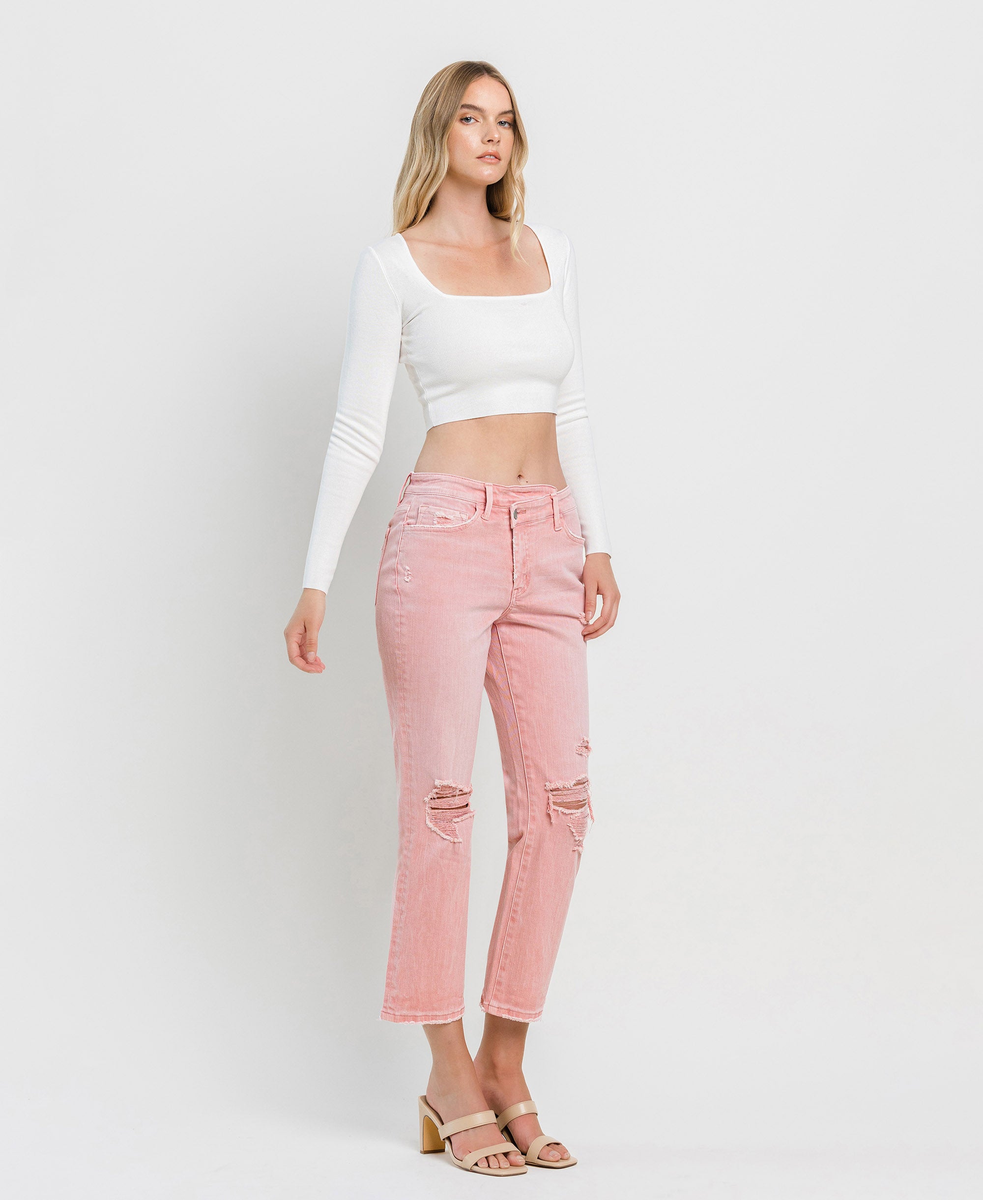 Experience comfort and luxury with our Bridal Rose High Rise Crossover Cropped Straight Jeans. The crossover waistband. high rise waist. and distressed detailing add a tasteful and exclusive touch to your wardrobe.