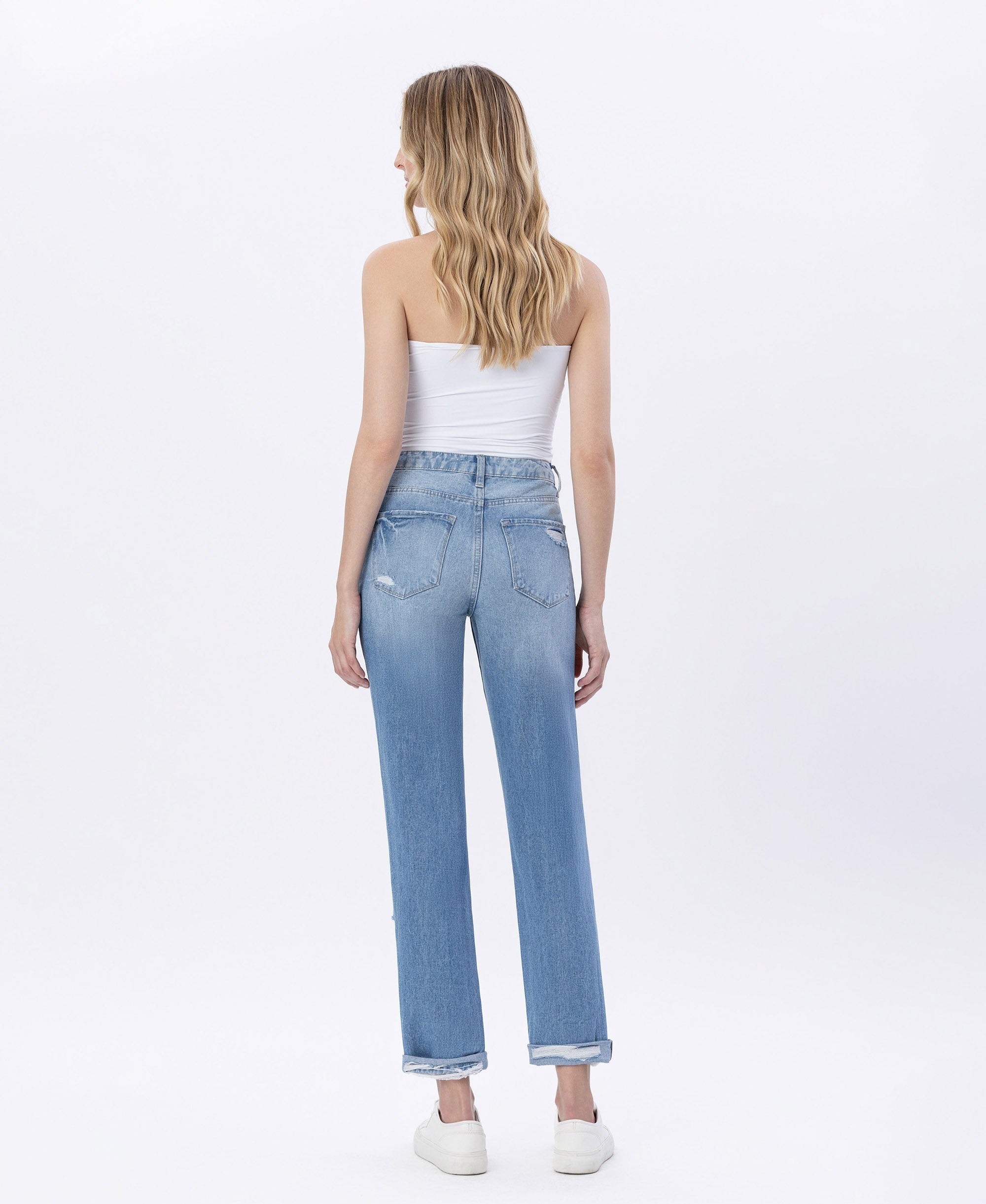 Crafted from non stretch denim. these jeans offer a super high rise waist for a flattering fit. The distressed detail and double cuffed hem add a touch of edginess. while the cropped length gives a chic and sophisticated look.