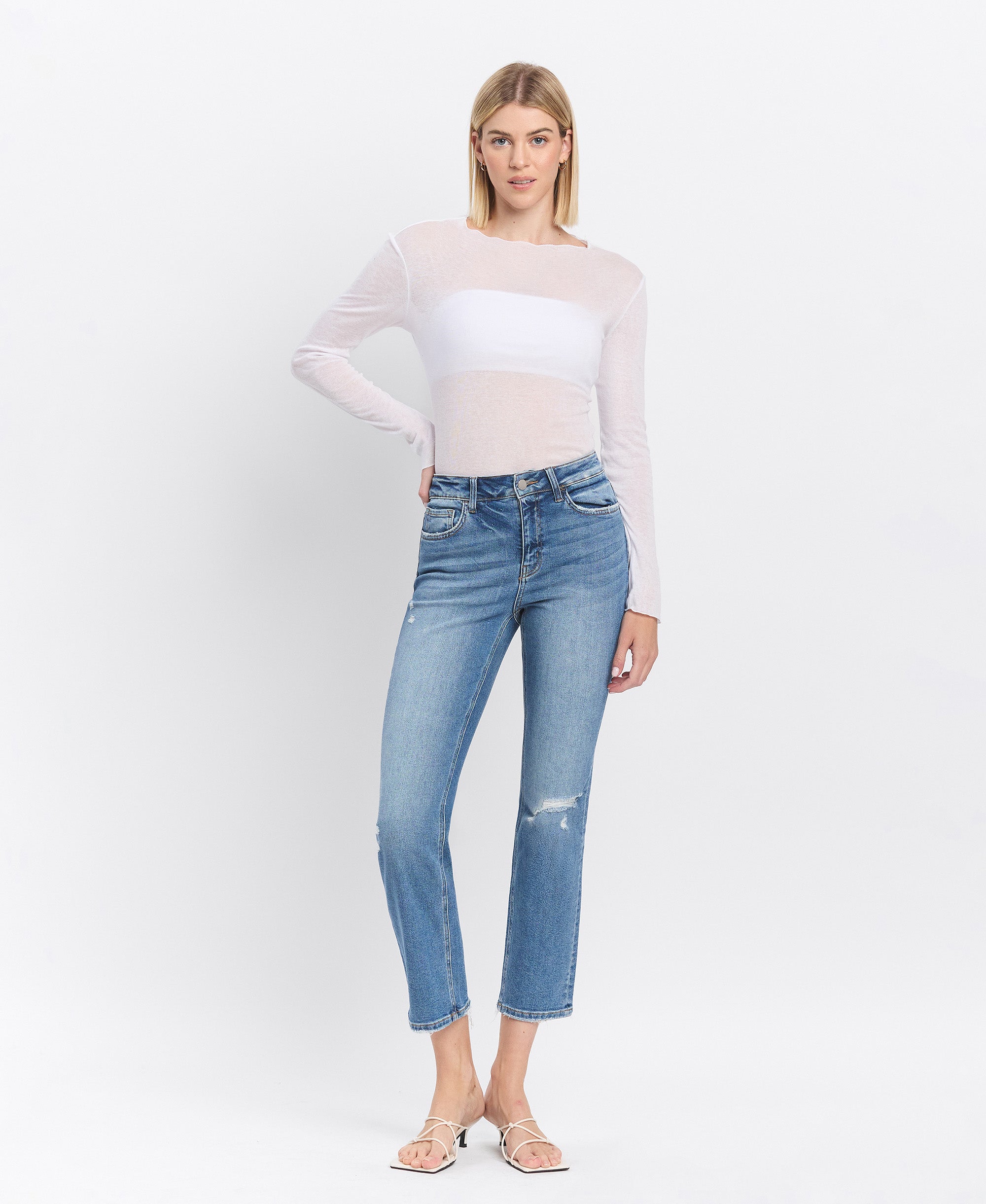 High Rise Slim Straight Jeans offer a high rise waist. comfort stretch denim. and slim straight fit to provide comfort and style. Featuring distressed detail and cropped length. these jeans provide a polished casual look.