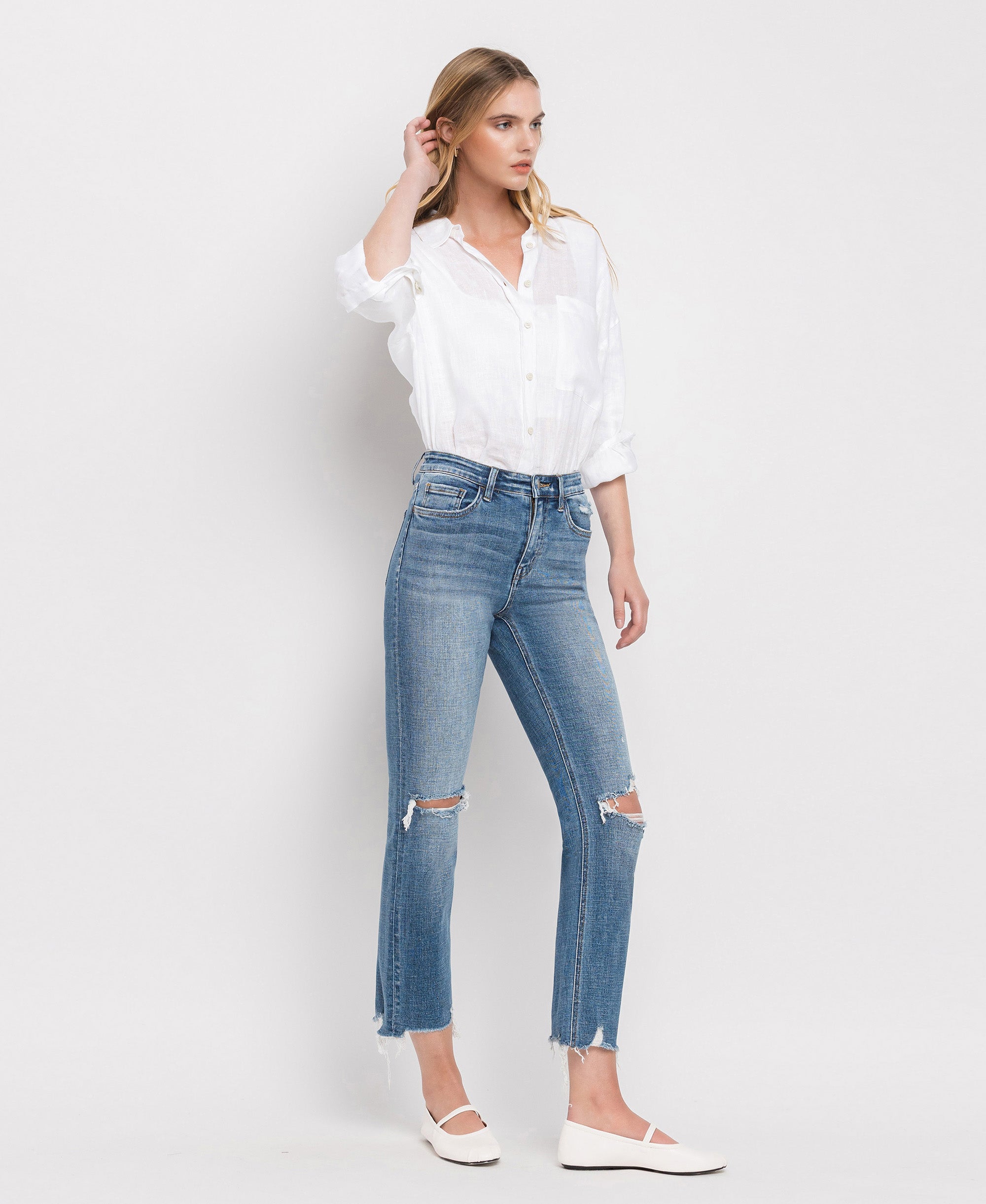 Our Holly High Rise Distressed Hem Slim Straight Jeans feature high rise comfort stretch denim. distressed detail. and a cropped length slim fit with a straight leg.?
