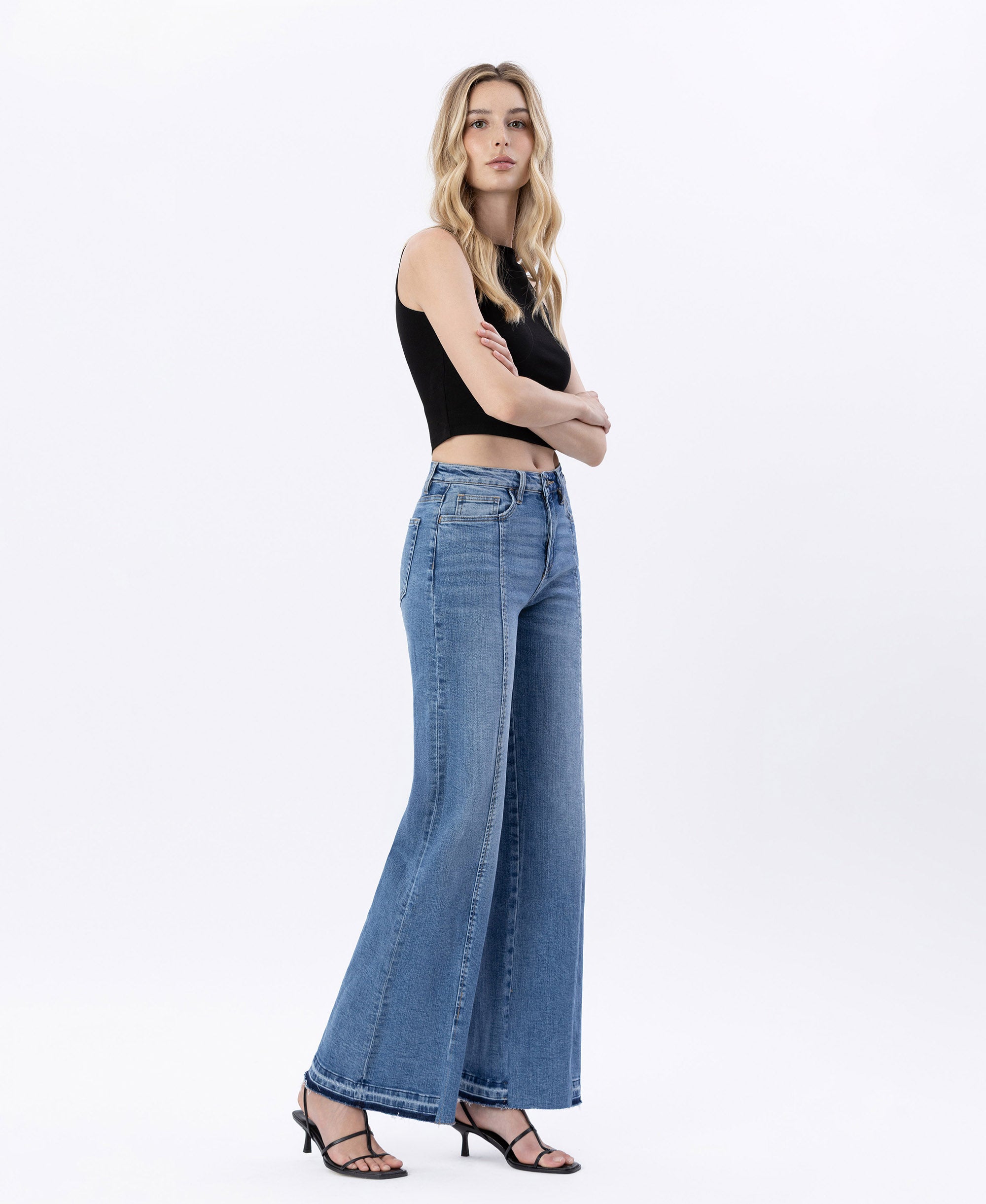 Experience luxurious comfort and elevated style with our comfort stretch denim. super high rise waist. and split seam detail. These full length. wide leg jeans will elevate any look and make you feel like a true fashion icon.