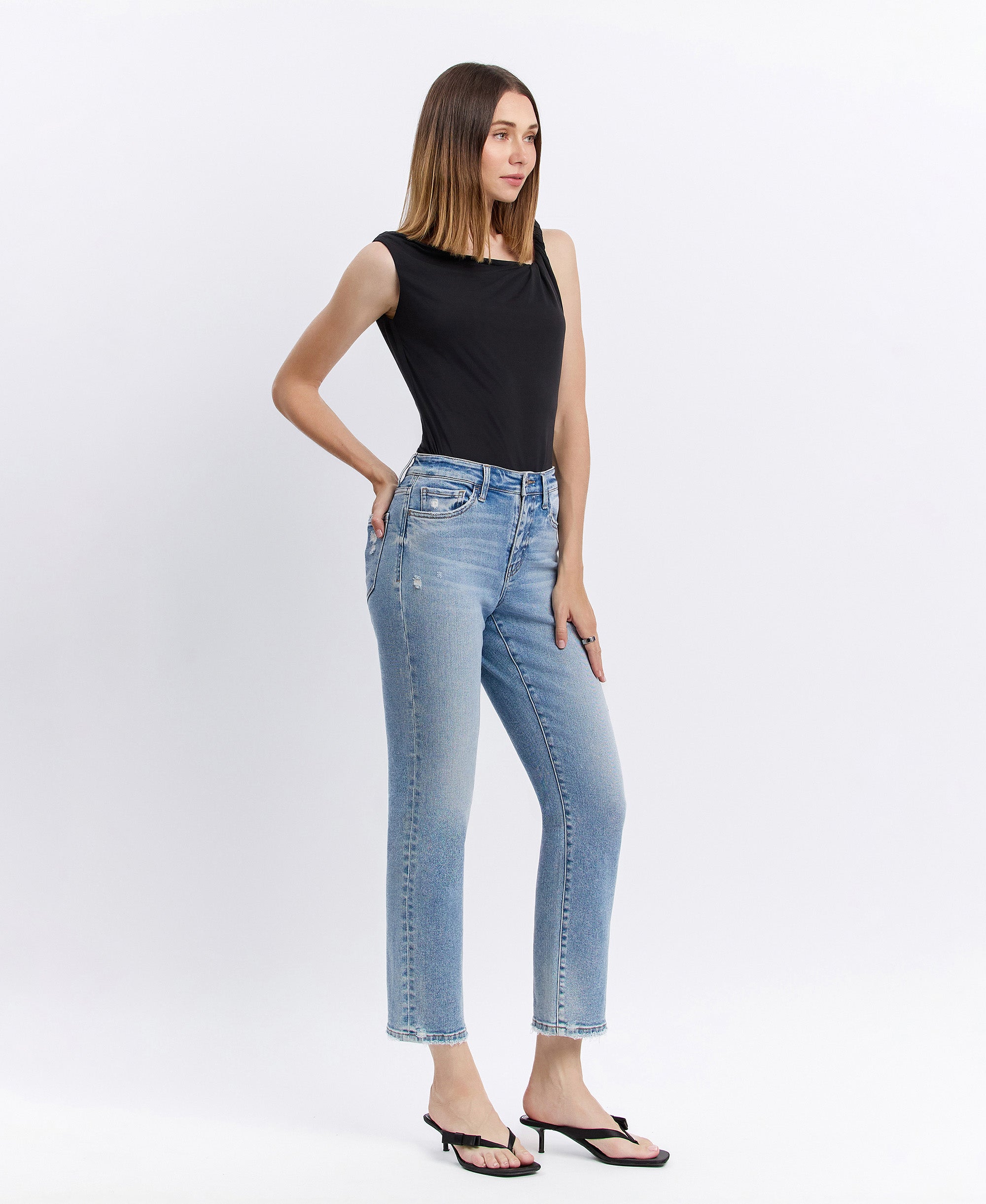 Conquer the day fearlessly with our Sweetheart jeans. Made with comfort stretch denim. these high rise regular straight jeans offer a flattering fit and feature a hint of distressed detail and a frayed hem for added edge. Perfect for any adventure. these ankle length jeans will become your go-to for everyday confidence!